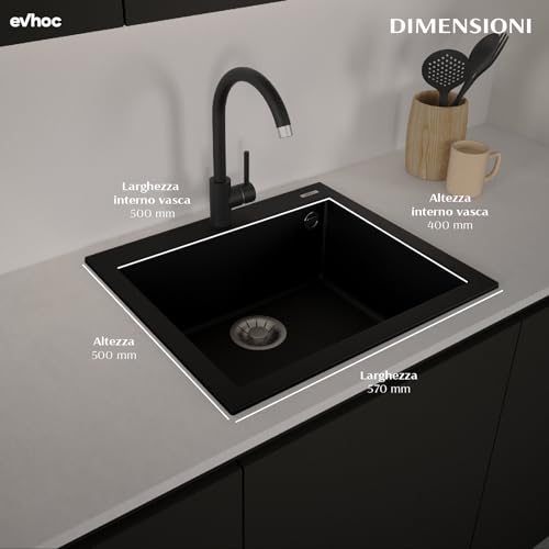 EVHOC Lavello di Design per Cucina 1 Vasca UNICUM S Sopratop, Lavandino in Kuarzite Vasca Unica, Piletta e Accessori per il Montaggio Inclusi, Made in Italy, Nero, 57x50 cm