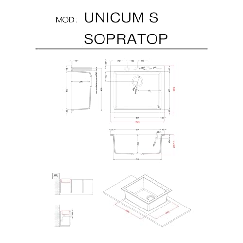 Dimensioni: Ha dimensioni 57 x 50 cm, con foro d'incasso 55 x 48 cm, fondo vasca alto 20 cm e peso di circa 15kg e foro scarico di 3,5”. Metodo di installazione sottopiano. Il troppopieno è targato EvHoc e gli accessori per il montaggio sono compresi