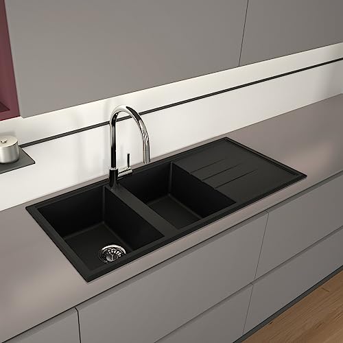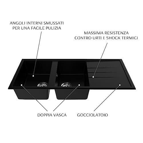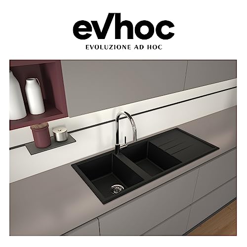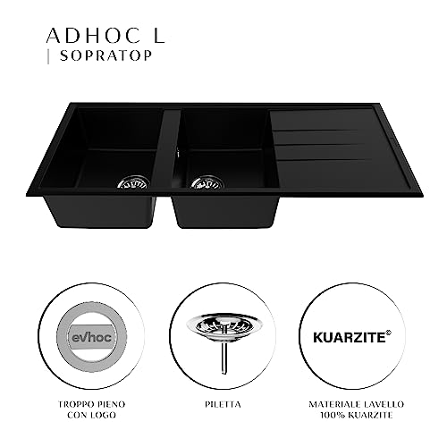 EVHOC Lavello di Design per Cucina 2 Vasche con Gocciolatoio ADHOC L Sopratop, Lavandino Reversibile in Kuarzite Due Vasche, Piletta Inclusa, Made in Italy, Nero, 116x50 cm