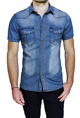 Evoga Camicia di Jeans Uomo Denim a Maniche Corte Casual Slim Fit (L, Denim)