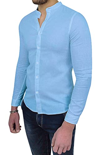 Evoga Camicia Uomo Sartoriale in Lino Casual Estiva Slim Fit (L, Azzurro)