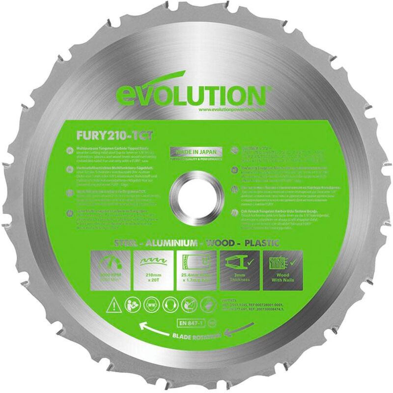 La lama multiuso FURY 210 mm TCT consente alle seghe Evolution di tagliare facilmente acciaio, alluminio, plastica e legno (persino legno con chiodi). Dotato di un corpo della lama temprato, che assicura che la lama funzioni più a lungo. Una configurazione avanzata dei denti TCT consente tagli rapidi ed efficienti e denti in metallo duro di alta qualità consentono una lunga durata. La lama FURY da 210 mm TCT non mostra debolezza quando si affronta materiali robusti.