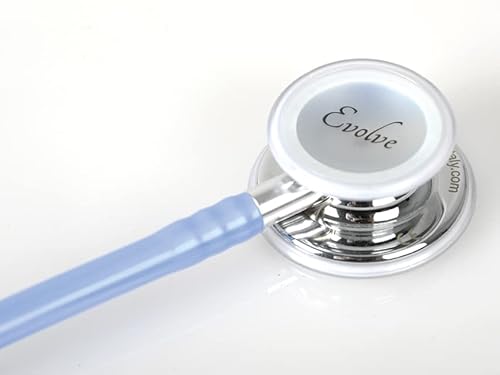 GIMA Evolve Stetoscopio Duofono, Doppia Testa Brillante Ø 48 e 36 mm, Anello Trasparente, Celeste Glitter, Archetto a Specchio, Lunghezza 75 cm, Etichetta Nome, Kit di Ricambi di Olive e Membrane