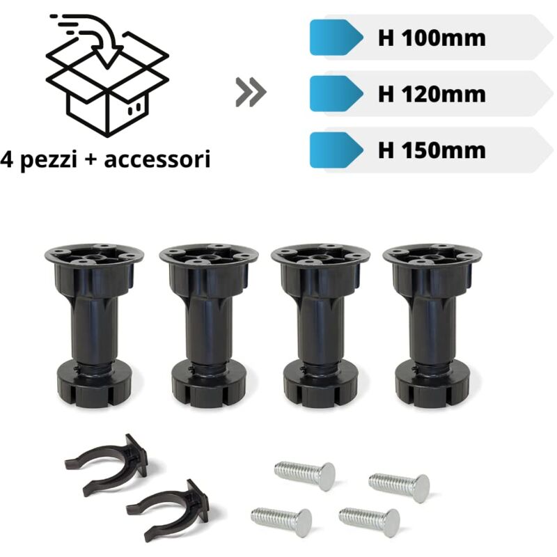Materiale premium: I piedini in plastica regolabili sono realizzati in plastica ABS di alta qualità, che è molto resistente e durevole, impermeabile e resistente alla corrosione, garantendo allo stesso tempo un bell'aspetto. Ogni set comprende: 4 piedini regolabili + 2 pinze clip + 4 vite Base stabile: La base allargata a quattro fori viene utilizzata per aumentare l'area di appoggio e il peso di ciascuna gamba del mobile viene aumentato a circa 80 kg. Ampia gamma di applicazioni: i piedini regolabili sono adatti a tutti i luoghi necessari in camere da letto, cucine, bagni, come letti, armadi, cassettiere e divani, ecc. MADE IN ITALY