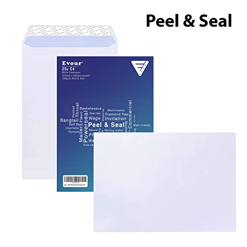 Evour - Buste tascabili formato A4/C4, con chiusura adesiva, 229 x 324 mm, 100 g/m², senza finestre, confezione da 25