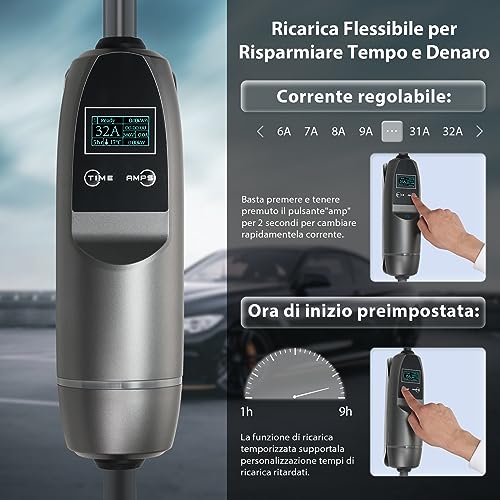 Corrente Commutabile e Preset Timer: il caricabatterie EV di Tipo 2 Portatile con schermo OLED e pulsanti. La corrente è regolabile tra 6-32A via il button ‘Amps' per soddisfare le diverse esigenze di ricarica (ATTENZIONE: la corrente non può essere cambiata durante la ricarica);