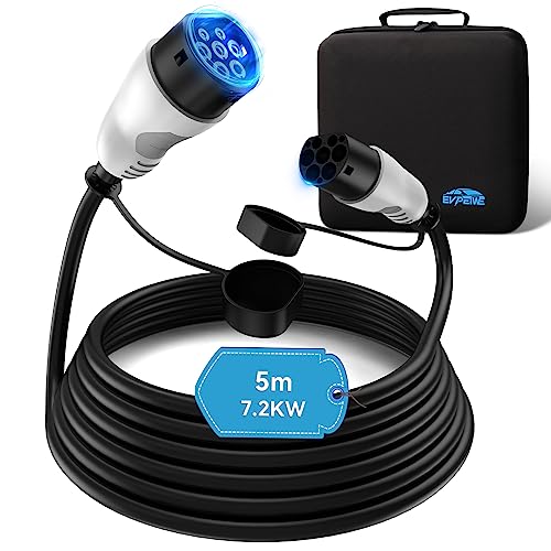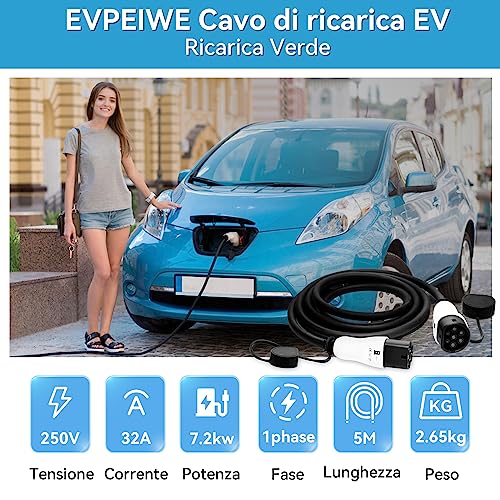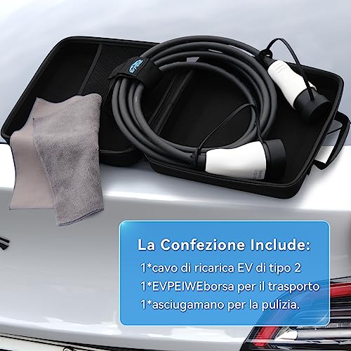 EVPEIWE Cavo di Ricarica Auto Elettrica Tipo 2| 7.2KW | 32A | 5M | Monofase EV Cavo Ricarica Tipo 2 a Tipo 2 Compatible con Model S/ 3/Y, Zoe, 500e, e-208, ID.3, ID.4, con Borsa per Trasporto