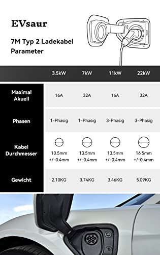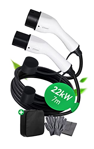 EVsaur Cavo di ricarica tipo 2, 22 kW, 3 fasi, 32 A, 7 m, facile da trasportare, per Model 3, e-UP, ID.3, Zoe, forTwo, Kona, e-Tron e altri EV, auto elettriche, PHEV