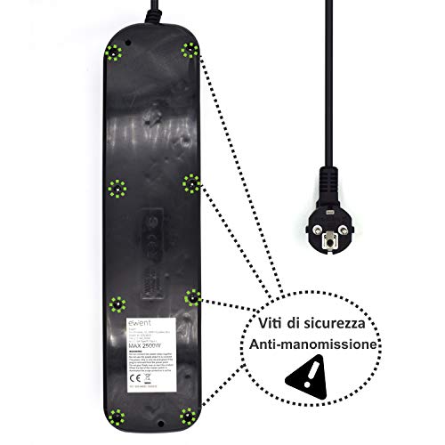 Ewent EW3851 Multipresa Elettrica a 6 Posti ITA/Schuko indipendenti su Ogni Presa e Interruttore Generale, Schuko 16A, 2500W, Nera