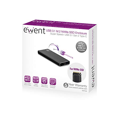 BOX SSD COMPATIBILE M2 NVMe PICe. Ewent Enclosure SSD esterno è compatibile con SSD PCIe NVME M.2 con M-Key & M+B Key 2230/2242/2260/2280, come Samsung / Crucial / Kingston / Seagate / WD / Integral / PNY, ecc. Il contenitore SSD supporta Windows / Mac, OS / Linux. Basta collegare e riprodurre senza dover installare driver o software aggiuntivi richiesti. NON supporta M.2 SATA B Key e B + M Key SSD