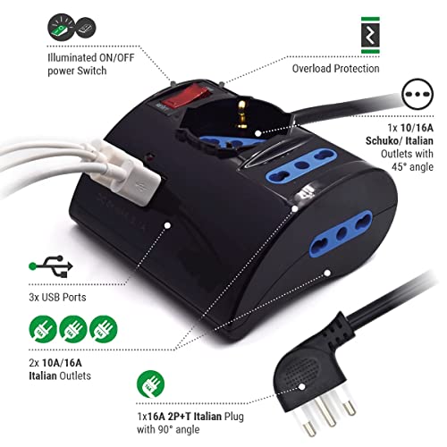 3 POSIZIONI ELETTRICHE: 3 prese (2 Bipasso ITA 10/16A e 1 Schuko), 3USB, Ciabatta dotata di fori con protezione per bambini. Ciabatta Elettrica Multipresa Protetta, Protezione da sovraccarico, Spina 16A, Interruttore di sicurezza. In caso di sovraccarico, l'interruttore delle ciabatte elettriche si aprirà automaticamente.