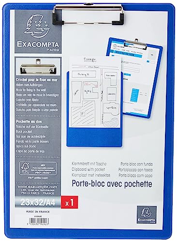 Exacompta 19292E Porta blocco in cartone Balacron con busta in plastica e clip con sistema di fissaggio a parete Formato 23 cm x 32 cm per documenti formato A4 colore blu.