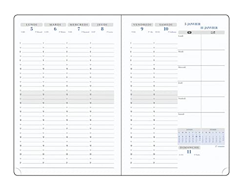 La ricarica del tuo diario è realizzata in Francia in modo ecologico responsabile con una carta proveniente da foreste gestite sostenibili. Settimana su 2 pagine in verticale, visione della settimana a colpo d'occhio, ampia ampiezza oraria dal lunedì al sabato (7:00 alle 21:00), piccolo spazio per note la domenica. Edizione francese. Rilegatura in rilievo cucita per una maggiore resistenza.