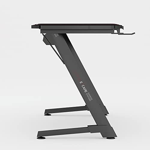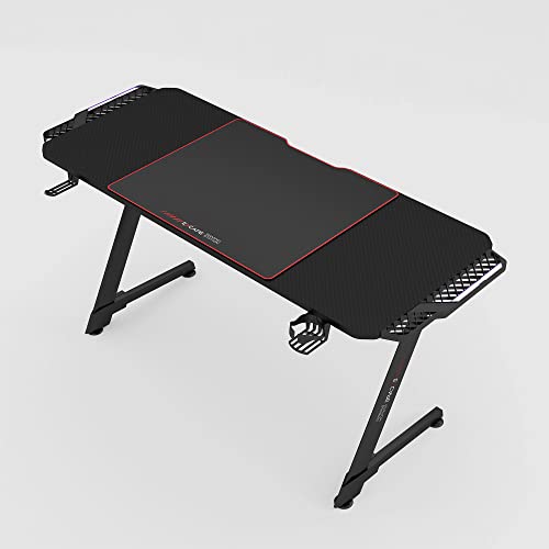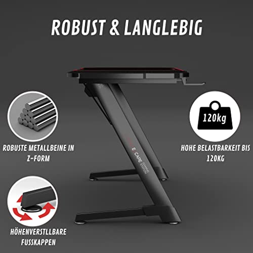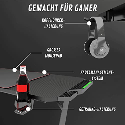 EXcape Tavolo da gaming Z14 con illuminazione LED 140cm (+16cm extensions) x 60cm - gambe a Z, carbon look, scrivania da gioco - incl. porta bevande, porta cuffie - tavolo per PC, scrivania per gamer
