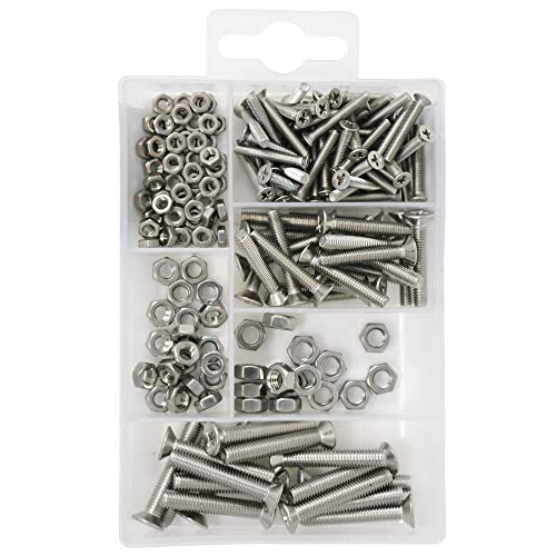 Ottimo kit per la casa o il posto di lavoro. Contiene un assortimento di dimensioni di viti per macchina con dadi esagonali di dimensioni corrispondenti.