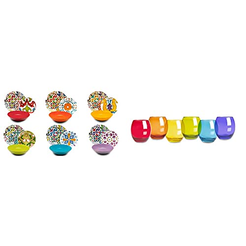 Excelsa Lisbona Servizio Piatti 18 Pezzi, Porcellana E Ceramica, Multicolore & San Josè Set 6 Bicchieri Acqua, Vetro, Multicolore