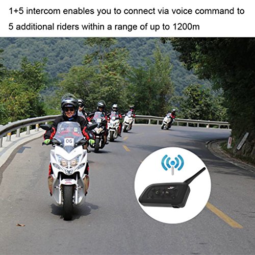 Excelvan - Mod. V6 - Interfono per casco da motociclista, con auricolari e Bluetooth, consente la comunicazione con fino a 6 motociclisti ad una distanza fino a 1200 m, con spina EU BT
