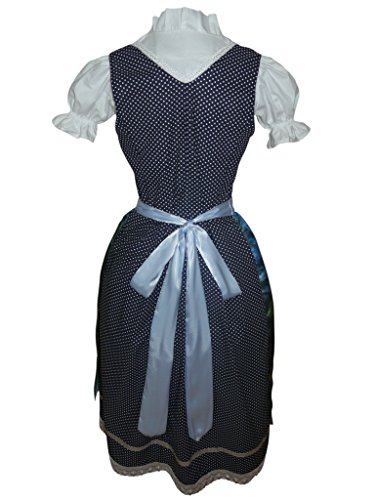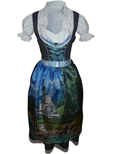 DI09 Exclusives, lungo Dirndl, 3 pezzi, costume blu con una camicetta e un bel grembiule con motivi paesaggistici, taglia 44