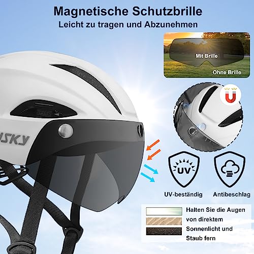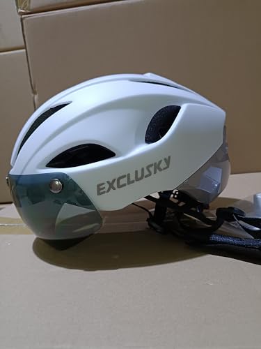 Exclusky Casco Bici Uomo Donna Casco Bici con Luce di LED, Casco Bici da Corsa con Magnetica Staccabile Shield Casco Bici mtb Leggero Casco da Ciclismo Regolabile 59-61cm (bianco)