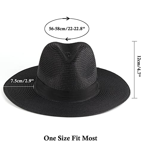 Exemaba Panama, cappello da donna a tesa larga, cappello di paglia da spiaggia, cappello estivo da uomo Roll-Up Fedora (nero), Nero, m