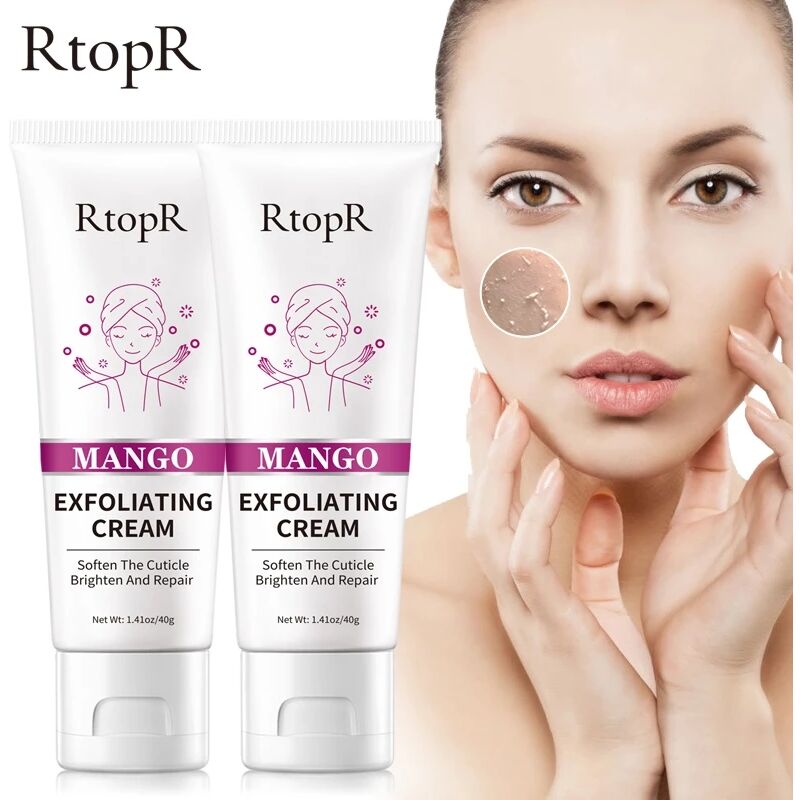 MANGO EXFOLIATING CREAM Brand:RtopR Slogan: Soften The Cuticle Brighten And Repair Net Wt:1.41oz/40g EFFECTS: Gel texture, contains mango essence, helps soften the cuticle and removes old dead horny, cleans and penetrates the dirt and greasy inside pores, increases the luster and permeability of skin, soothes and repairs the muscle surface, let your skin pure and shiny. INGREDIENTS: AQUA,CARBOMER,COCOTRIMONIUM CHLORIDE,GLYCERIN,PHENOXYETHANOL,PEG-40 HYDROGENATED CASTOR OIL,METHYLPARABEN,CHLORPHENESIN,AROMA,CALENDULA OFFICINALIS FLOWER EXTRACT,PROPYLENE GLYCOL,MANGIFERA INDICA (MANGO) FRUIT EXTRACT,ETHYLHEXYLGLYCERIN,CI 19140,CI 15985 USAGE METHOD: Wipe off the moisture after cleansing, apply proper amount of this product to the face, massage gently until the skin horny dirt appears, and then rinse off with clean water. CAUTIONS: If any discomfort, please stop using immediately. STORAGE: Please store in a cool dry place, avoid direct sunlight.