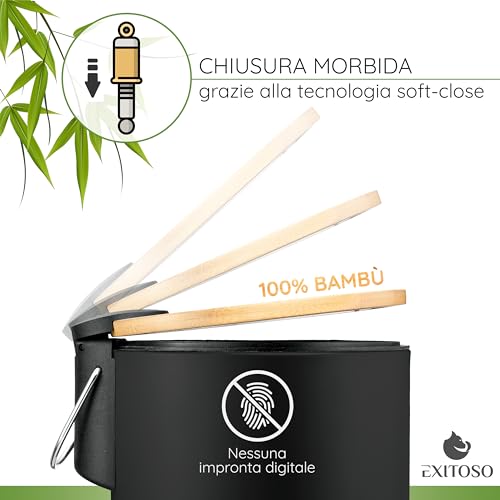 Exitoso Cestino Bagno Nero da 3 litri - Pattumiera Bagno Piccola con Coperchio e Pedale Design Nero - Cestini Secchio Bidone Spazzatura Rifiuti Immondizia da Bagno Metallo Bambu Cucina con Coperchio
