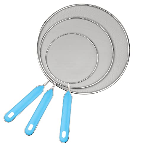 EXLECO 3 Pezzi Paraspruzzi in Acciaio Inox, Paraschizzi per Padella con Manico in Plastica, Coperchio Antischizzo, Paraschizzi Padella a Maglia fine, Rete Antispruzzo Multifunzione (19/25/29cm)