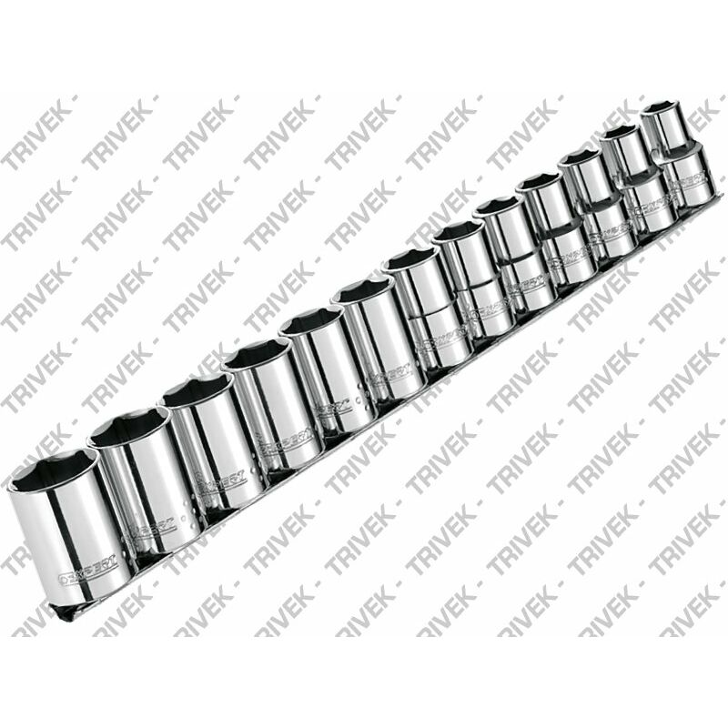 Serie di chiavi a bussola esagonali 3/8”: 1/4”-5/16”-11/32”-3/8”-7/16”-1/2”-9/16”-5/8”-11/16”-3/4”-13/16”-7/8”-1''. Fornita su rastrelliera metallica.