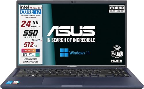 ASUS Expertbook Modello SLIM, Intel i7 13Th 10 core da 5Ghz, RAM 16GB, SSD PCIe 512 GB, 15,6" FullHD, WiFi 6E, 4 USB, Face ID, ethernet, fingerprint, tastiera retroilluminata, Win11, preconfigurato