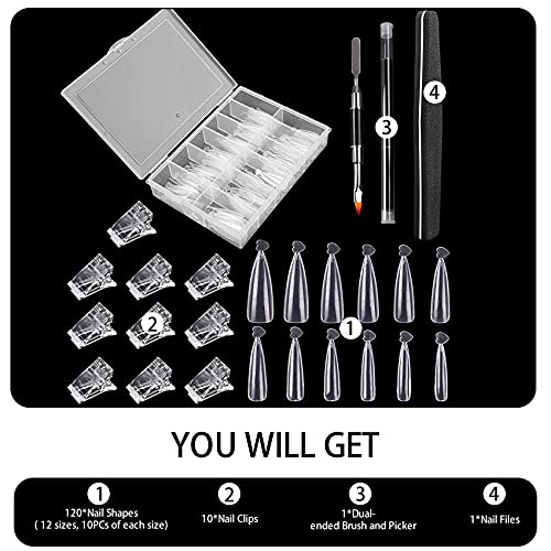 1YOU WILL GET: 120 pieces( 12 sizes, 10PCs of each size) of nail shapes, 10PCs nail clips, 1 dual-sided brush and picker, 1 nail files.