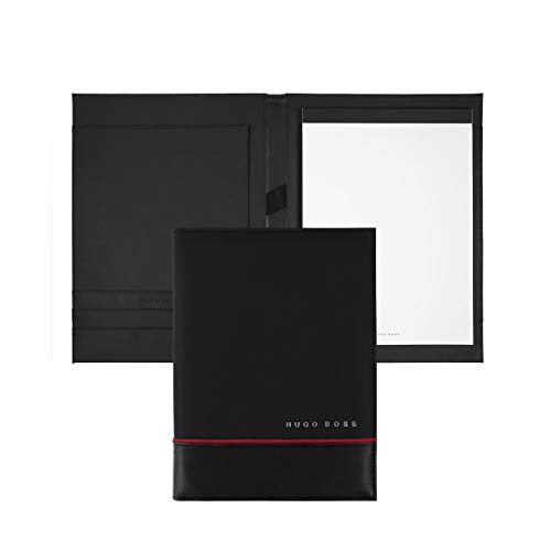 La cartella A5 con blocco da 40 fogli con elementi raffinati come il bordo colorato e il logo HUGO BOSS in metallo garantiscono dettagli forti