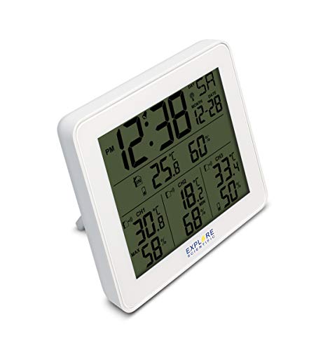 Explore Scientific WSH4003 Stazione Meteo Radio-Controllata con Allarme, Display retroilluminato blu con temperatura/umidità int/ext, Memorizza storico dati, 3 sensori inclusi, Bianco