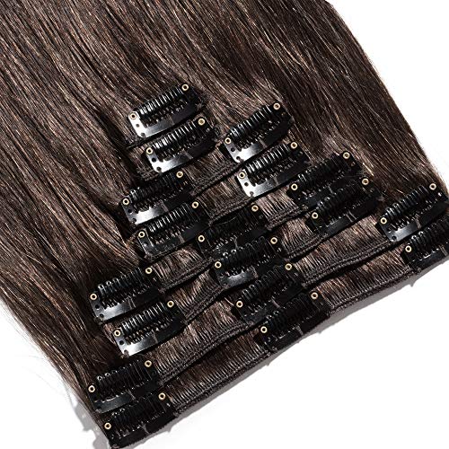 40cm Extension Capelli Veri Clip 8 Fasce 18 Clips 100% Human Hair Testa Intera 02# Marrone Scuro