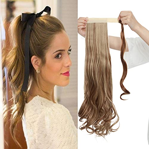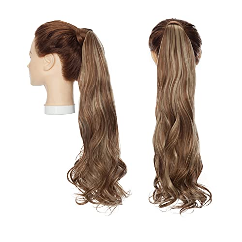 SEGO Coda Extension Capelli Mossi Ricci Clip in Ponytail Fiber Hair Sintetici Lunghi 50cm 100g Onda Bella - Castano Chiaro mix Biondo Cenere