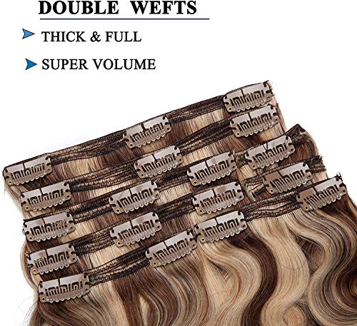 SEGO Extension Clip Capelli Veri Volumizzante 8 Ciocche Folte Capelli Ricci Mossi 100% Remy Human Hair Naturali Double Weft 45cm 140g #4P27 Marrone Medio mix Biondo Scuro