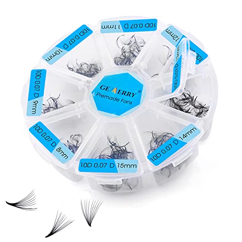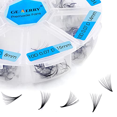SPECIFICHE: Gemerry estensioni ciglia ciuffetti, spessore: 0,07 mm, 10D ciuffetti volume russo D curl, 500PCS(+ -2%) promade ventagli ciglia, 8,9,10,11,12,13,14,15mm, 4,2 volte la quantità di altri vassoi per ventole prefabbricate a 12 file.