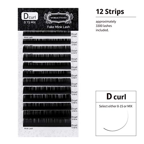 Extension per ciglia piatte, accessorio per extension per ciglia, per uso da salone di parrucchiere, D Curl, spessore 0,07 - 0,20 mm e lunghezza di 8 - 15 mm MIX (0.15mm, MIX)