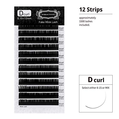Extension per ciglia piatte, accessorio per extension per ciglia, per uso da salone di parrucchiere, D Curl, spessore 0,07 - 0,20 mm e lunghezza di 8 - 15 mm MIX (0.15mm, 10mm)