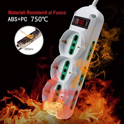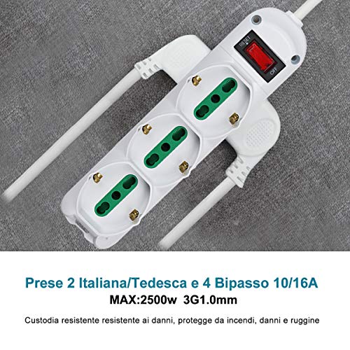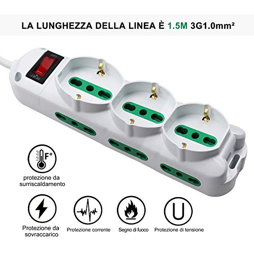 Ciabatta Elettrica Multipresa Protetta,Surge Arrest,Protezione da sovraccarico,Protezione da surriscaldamento,Spina 10 A,Prese 3 Italiana/Tedesca e 6 Bipasso 10/16A, Interruttore di sicurezza,Bianco Cavo da 1.5m.