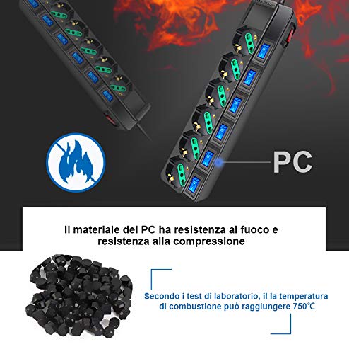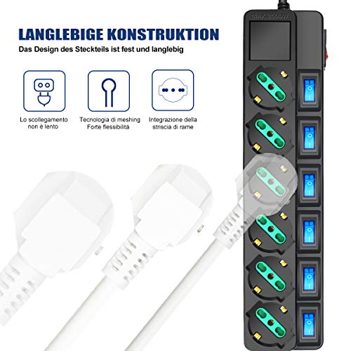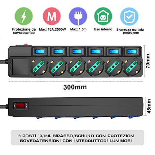 6 uscite con presa di corrente con spine Ita 10A/16A Schuko, Bipasso Schuko,con interruttori indipendenti ,ciabatta dotata di fori con protezione per bambini.