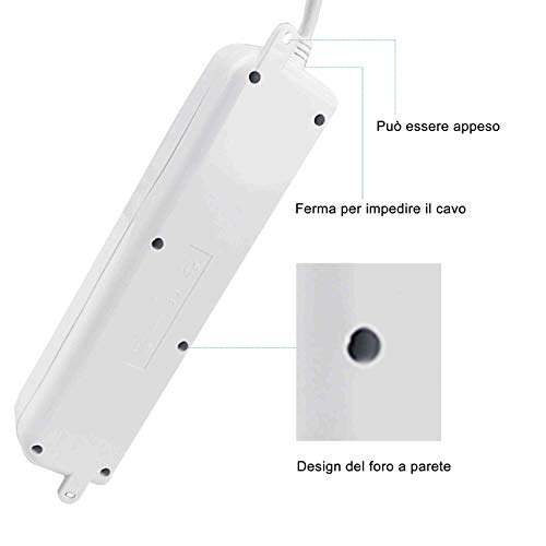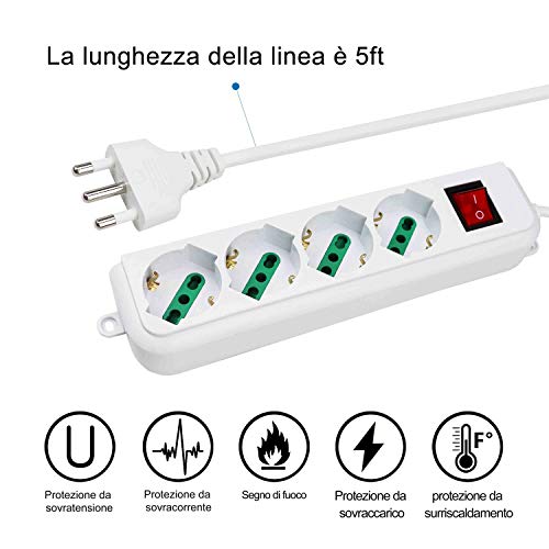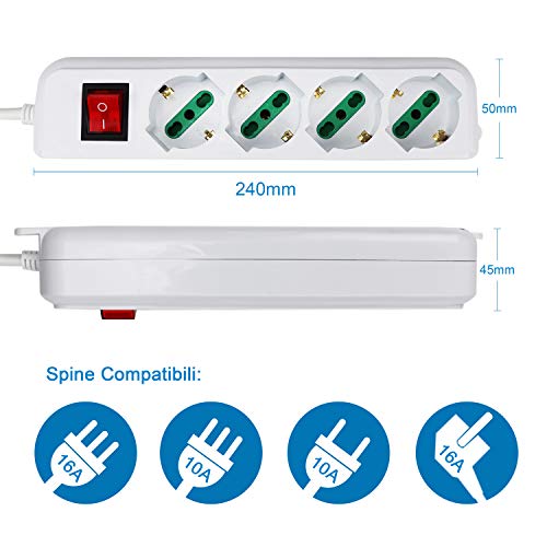 4 uscite con presa di corrente con spine Ita 10A/16A Schuko, ciabatta dotata di fori con protezione per bambini.