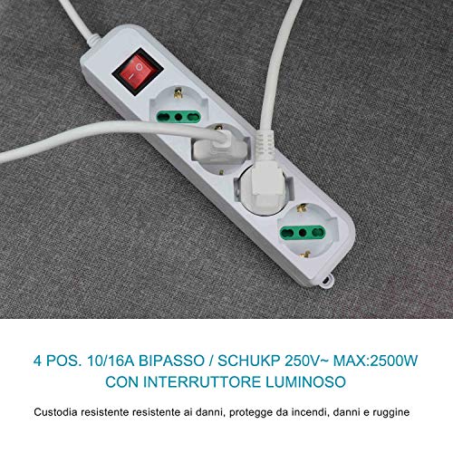 Extrastar Multipresa Ciabatta Elettrica con 4 Prese Universali ITA 10/16A e Schuko, Interruttore Luminoso, Cavo 1,5 m con Spina Italiana 16A, Bianco, bipasso.