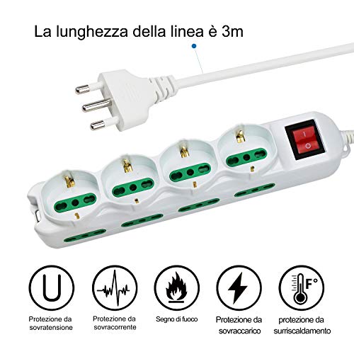 6 uscite con presa di corrente con spine Ita 10A/16A Schuko, ciabatta dotata di fori con protezione per bambini.