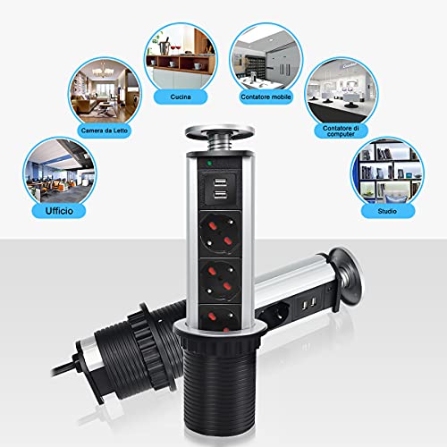 EXTRASTAR Multipresa da scrivania a scomparsa con 2 Usb, 3 Prese ITALIANE, torretta da tavolo, Colonnina con protezione, per cucina,piani di lavoro,ufficio