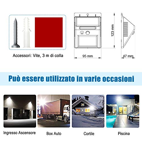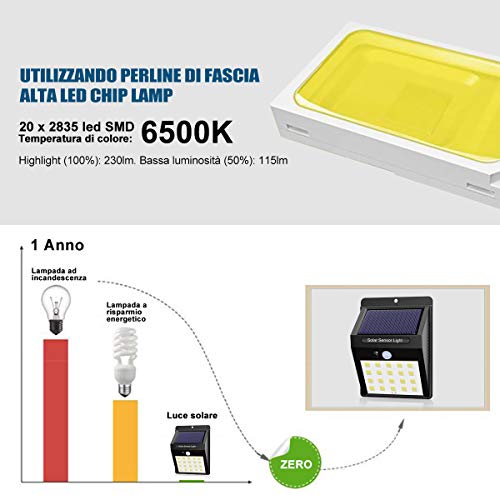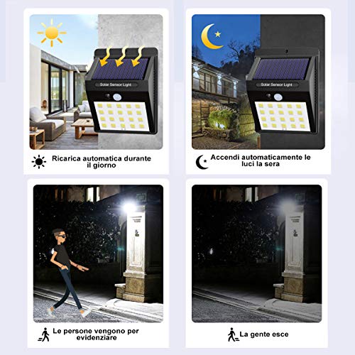 【4 Pacchi 20 LED luci solar esterno】Le dimensioni saranno 4.84 x 3.74 x 1.85 inch. Rilevatore di movimento ad angolo di 120 °, Angolo di illuminazione di 120°, luce solare potrebbe rilevare il movimento da 3 a 6 m/(10 piedi-19 piedi utilizzano pannelli solari da 1500 mAh. Rispetto alla maggior parte delle luci solari simili sul mercato, sono entrambe a risparmio energetico e rispettose dell'ambiente.