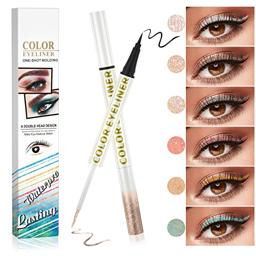 【Design a Doppia Testa】Questo eyeliner liquido lucido ha un design a doppia testa, 2 in 1 eyeliner liquido perlato metallico shimmer con eyeliner liquido impermeabile, doppio colore eyeliner cucitura stampaggio, facile da creare una lunga durata brillante scintillante trucco eyeliner colorato.