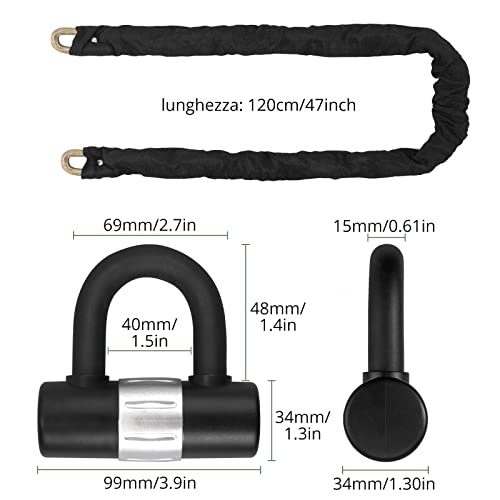 【Estensione della Catena】La catena è lunga 1,2 metri ed è sufficientemente lunga per adattarsi alla maggior parte delle moto, delle biciclette, degli scooter, delle porte, ecc. Alla fine della catena, il lucchetto a U consente di fissare lo scooter elettrico all'oggetto desiderato.