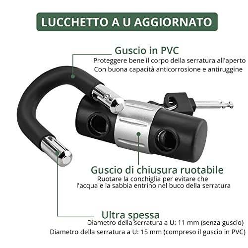 【Facile da Usare】Il lucchetto a U è progettato con una separazione unilaterale. Per utilizzare il lucchetto a U, inserire la catena attraverso il pneumatico e fissarla a un oggetto fisso come un'ancora, una recinzione o un palo, quindi bloccare il lucchetto a U in posizione.