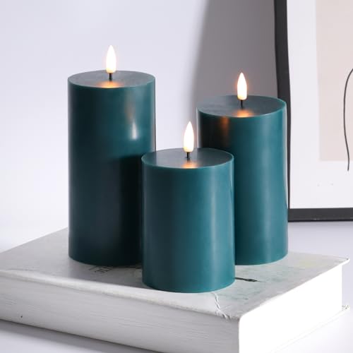 Eywamage Green Flat Top Flameless LED Pillar Candles with Remote, Flickering Battery Operated Candles Set of 3 Φ 3" H 4" 5" 6"
