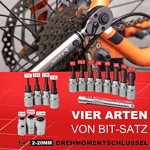 EZARC Chiave Dinamometrica 1/4", 2-20 Nm Chiave Dinamometrica bici con Doppia Scala, 100 mm Barra di Estensione, ±3% Alta Precisione per Biciclette da Strada, Mountain Bike, Moto